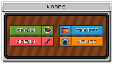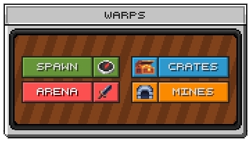 Quickly access important locations via the warps menu. Key destinations include: /spawn, /farm, /fishing, /crates, /arena.